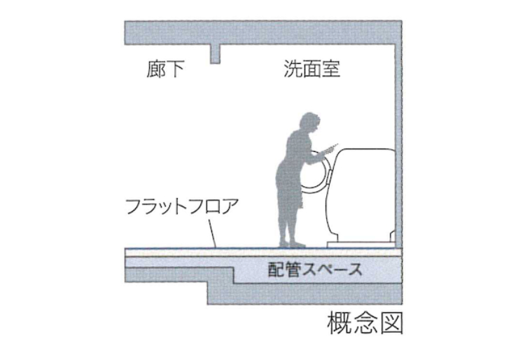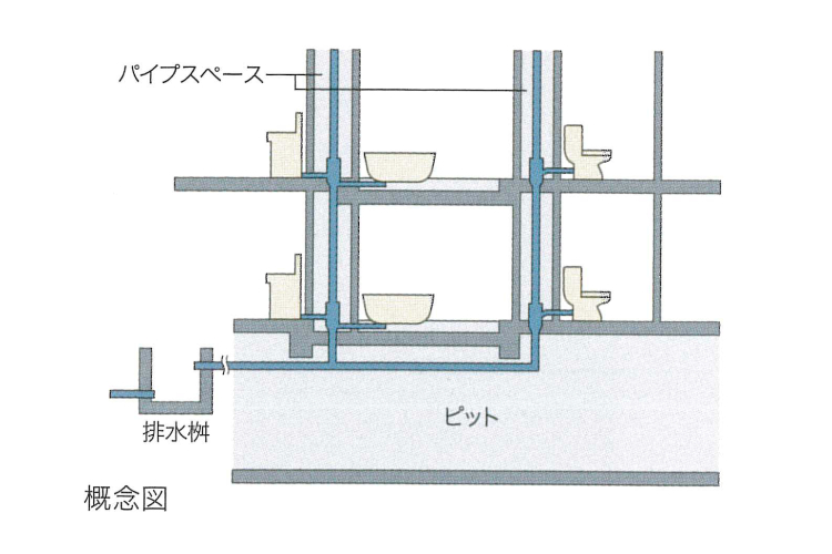 1階床下部分は排水主管が横引きとなるため、この部分の配管が地中にあると点検・ 補修が困難な上、補修に多大な費用がかかります。そこで、共用配管の保守点検時に、基本的に住戸内に入ることなく点検や部材交換が済むように床下配管ピットを設けています。