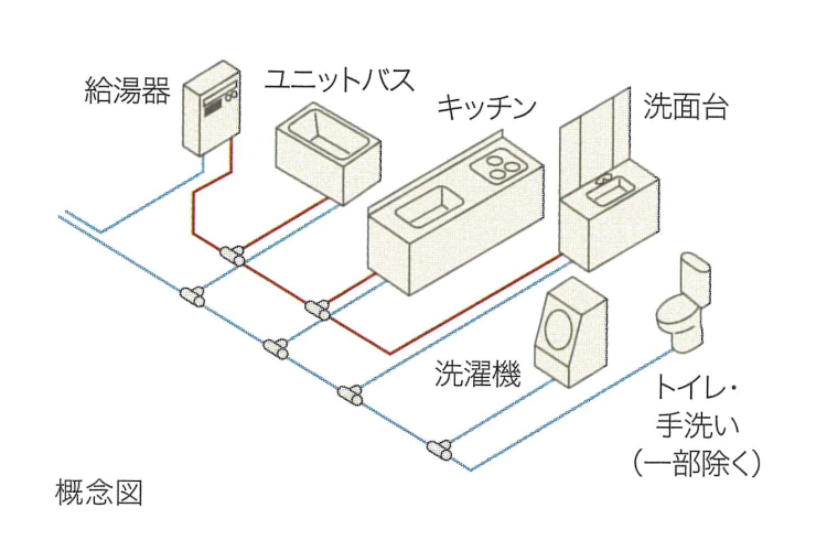 専用部の給水給湯管には錆や腐食の心配のない樹脂管を採用して耐久性と衛生面に配慮しています。また配管の接続には工場でのプレハブ工法を採用しています。漏水防止の為の信頼性を高めています。