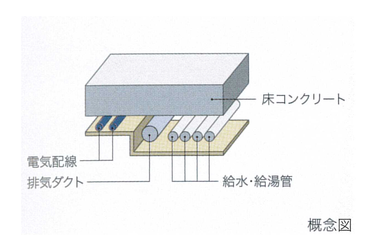 電気配線や水まわりの給水管などを専有部分の床コンクリートに打ち込まず、二重天井部分に施工することで、メンテナンスや更新、リフォームに配慮した設計としています。
