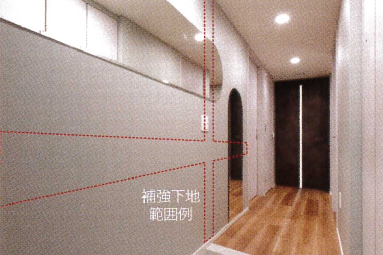 高齢者へのバリアフリーの配慮として、専用部の玄関、廊下、 トイレに将来の手摺取付をしやすくする下地補強が施されています。