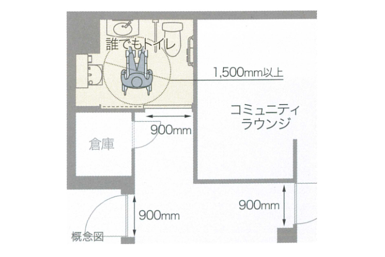 誰でもトイレ内は車椅子の転回のしやすさを考慮し、回転スペースが確保されています。